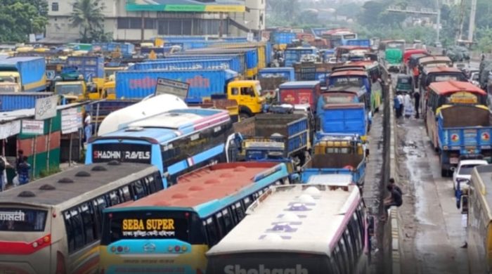 নিউজ ডেস্কঃ ঢাকা-চট্টগ্রাম মহাসড়কের নারায়ণগঞ্জের অংশে ২০ কিলোমিটার দীর্ঘ যানজট সৃষ্টি হয়েছে। এতে চরম ভোগান্তিতে পড়েছেন দূরপাল্লার যাত্রী এবং যানবাহন চালকরা। জানা যায়, বুধবার ভোররাতে মহাসড়কের মোগড়াপাড়া এলাকায় চট্রগ্রামগামী লেনে