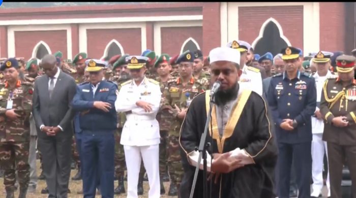 জানাজা শেষে শহিদ শান্তিরক্ষীদের মরদেহে রাষ্ট্রপতি, প্রধান উপদেষ্টার পক্ষ থেকে শ্রদ্ধা জানানো হয়। এরপর একে একে তিনবাহিনীর পক্ষ থেকে শহিদদের কফিনে শ্রদ্ধা জানানো হয়। এরপর শহিদ ছয় সেনাসদস্যের মরদেহ হেলিকপ্টারযোগে
