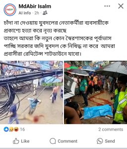 চাঁদা না দেওয়ায় যুবদলের নেতাকর্মীরা ব্যবসায়ীকে প্রকাশ্যে হত্যা করে নৃত্য করছে
